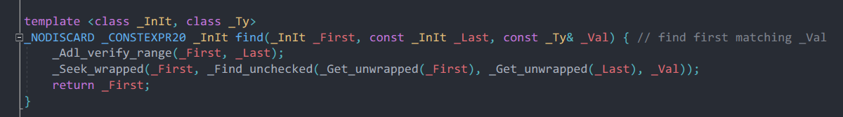순차적으로 first 를 ++ 해나가다가, 내가 넘긴 val 과 동일한 요소를 발견하면 이 요소의 iterator 를 return 한다.